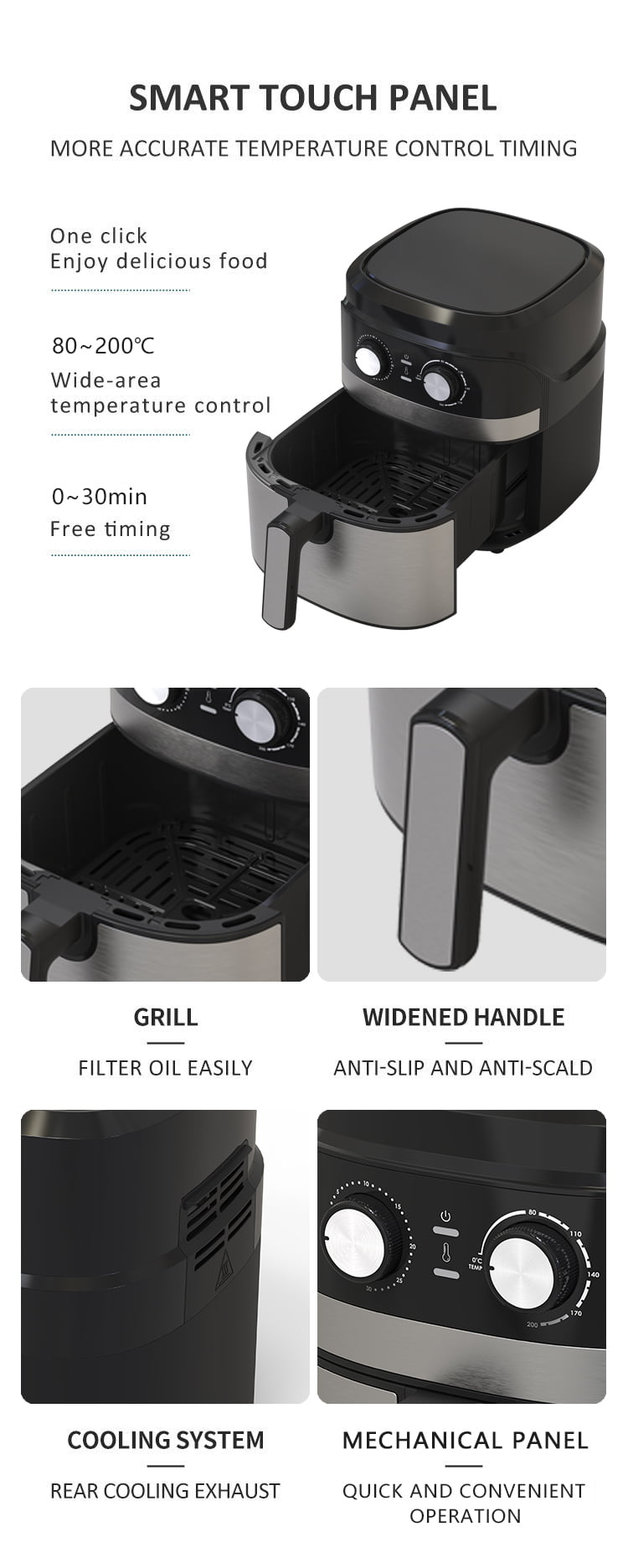 A YYZG-550S 5.5L Air Fryer egy rugalmas konyhai készülék, amelyet zöld és praktikus főzésre terveztek. Felhasználóbarát gombkezelésével a hőmérséklet és az időzítő beállításainak megküzdése szellő, biztosítva, hogy az egyedi kezelés a főzési rendszeren keresztül. A mechanikus panel már nemcsak egyszerűsíti a működést, hanem a túlmelegedés biztonságát is magában foglalja a felhasználás időtartamának biztonságához. A 0-30 perces, nem rögzített időzítési jellemzője lehetővé teszi a sütési példányok testreszabását, rengeteg recept kielégítését. A csodálatos, nem tapadó főzőpadló lehetővé teszi a sima tisztítást, míg a beépített nyolc intelligens menük korszerűsíti a főzést.